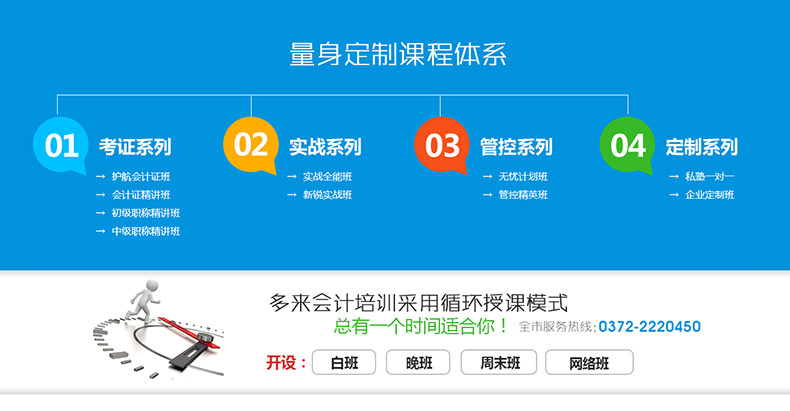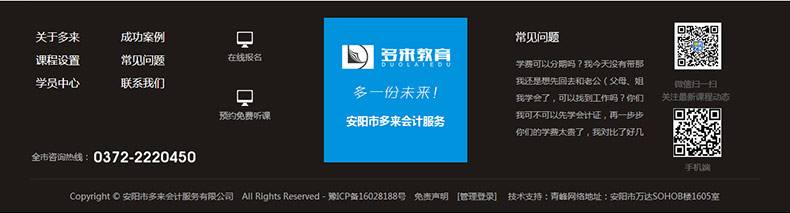 安陽市多來會計服務(wù)有限公司是由河南多來教育集團(tuán)和河南因心財務(wù)之家領(lǐng)導(dǎo)下首創(chuàng)一站式會計培訓(xùn)、企業(yè)注冊、代理記賬、商標(biāo)注冊、品牌策劃營銷等于一體的多元化企業(yè)會計服務(wù)平臺。致力于為中小型企業(yè)服務(wù),資源整合,培訓(xùn)出會計人才,為中原崛起助力、打造河南具影響力的企業(yè)服務(wù)平臺。客戶表示設(shè)計較好,細(xì)節(jié)上很到位,今后會多與青峰網(wǎng)絡(luò)合作。